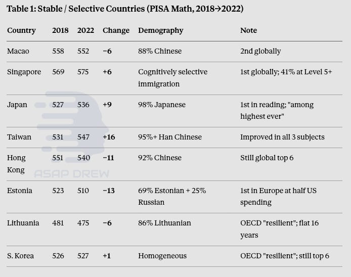 Finland is the proof case in reverse. Finland got elite teachers (top 17% of applicants, master’s degrees required) because it had a homogeneous, high-IQ population that was genuinely teachable.