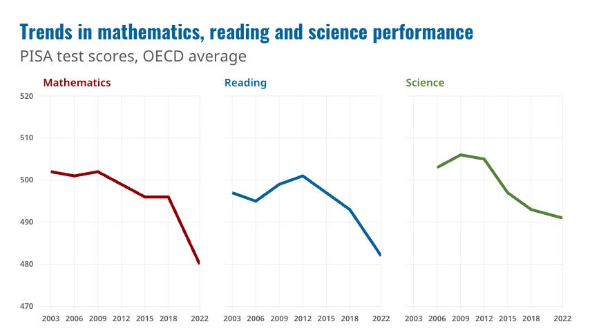The OECD’s PISA 2022 results show the OECD math average falling a record ~15 points (489→472) between 2018 and 2022 — triple any previous decline. Reading dropped 10 points, double the prior record.