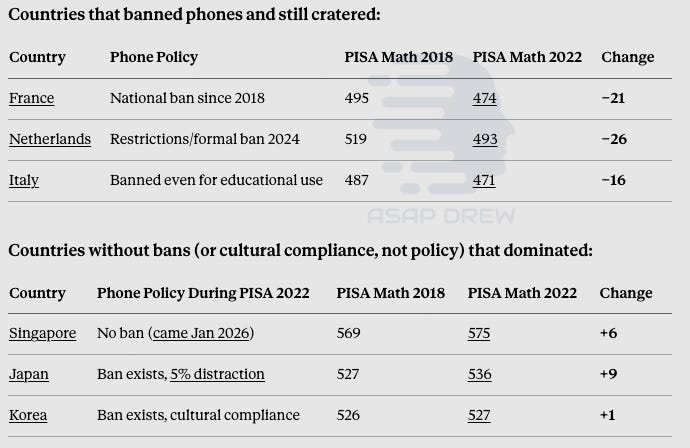 A King’s College London analysis found countries with more bans actually scored lower — every 10% increase in schools banning phones correlated with a 9.4-point PISA decrease.