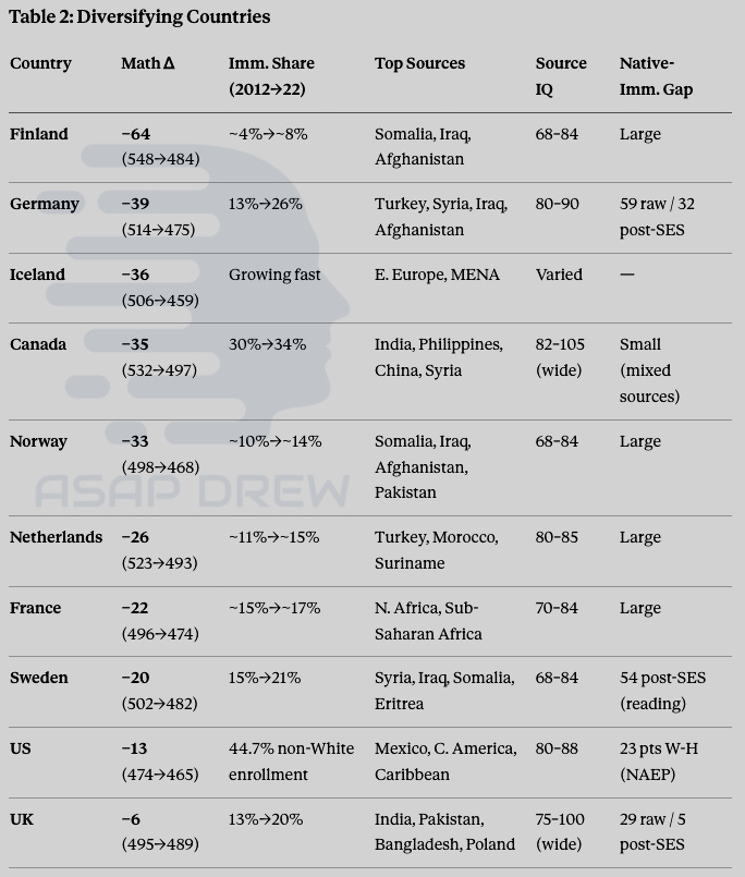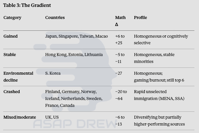 The UK’s moderate decline despite heavy immigration, driven by a partially high-performing Indian immigrant stream, confirms the mechanism: it’s not immigration volume, it’s origin-country cognitive profile.