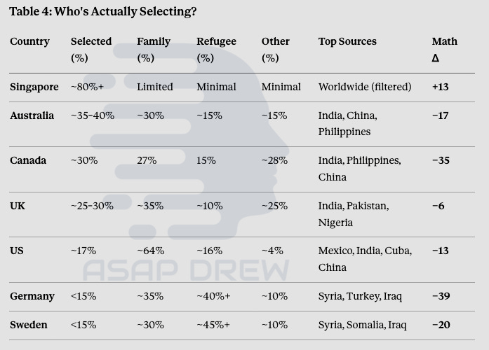 The standard narrative contrasts “selective” systems (Canada, Australia) with “unselected” systems (US, Europe). This is misleading. Almost no Western country actually selects the majority of its immigrants on cognitive ability. The question is what fraction slips through without any selection — and from where.
