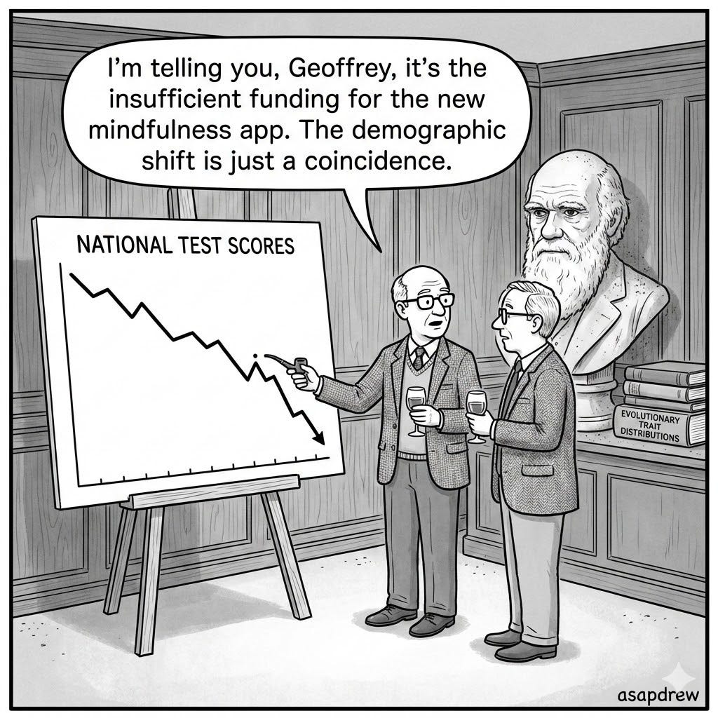 No economist, education researcher, or policy analyst can say “test scores are falling because we imported millions of people with lower cognitive potential and the least capable members of every group are having the most children” and keep their job. So they find real but secondary mostly bullshit factors — COVID, phones, teacher shortages, AI offloading — and present those as the whole story.