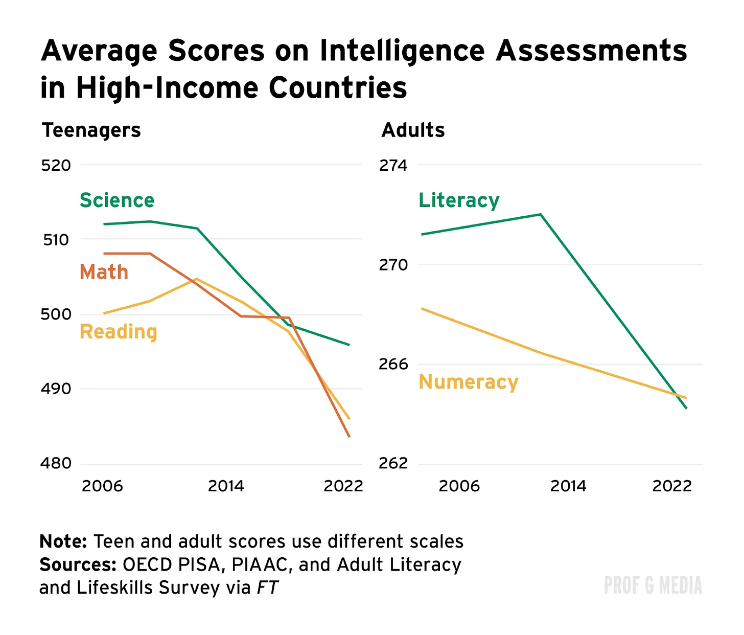 A viral chart “Average Scores on Intelligence Assessments in High-Income Countries” from ProfGMedia’s writeup: “Is AI Making Us Dumb?” — sparked a lot of debate on X (Twitter) over the causes of widespread declines in academic performance in teens and adults.
