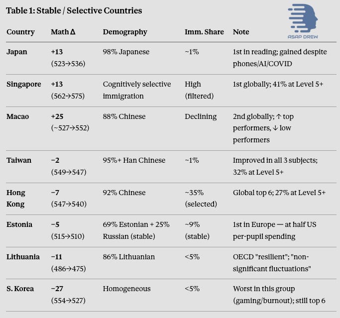 Japan didn’t gain 13 points because it discovered a pedagogical secret. It gained because it has the same 98% Japanese population it had in 2006, with the same cognitive distribution, the same parental investment culture, and the same genetic substrate — and it didn’t dilute any of that with unselected immigration.