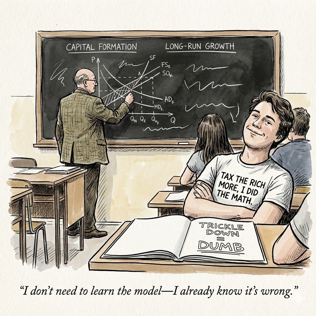 Rich countries aren’t capital‑starved. The binding constraint is often good projects and demand, not raw savings. So more after‑tax cash at the top doesn’t automatically translate into new real investment.