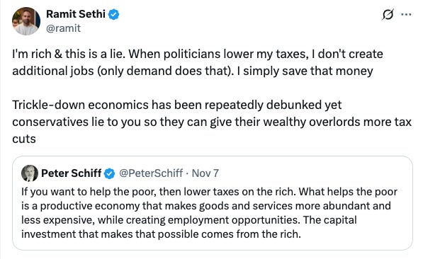 “You think cutting taxes and regulation on the ‘rich’ and on capital leads to more investment, growth, and eventually better living standards for everyone. But the rich just pocket it and nothing trickles down!”