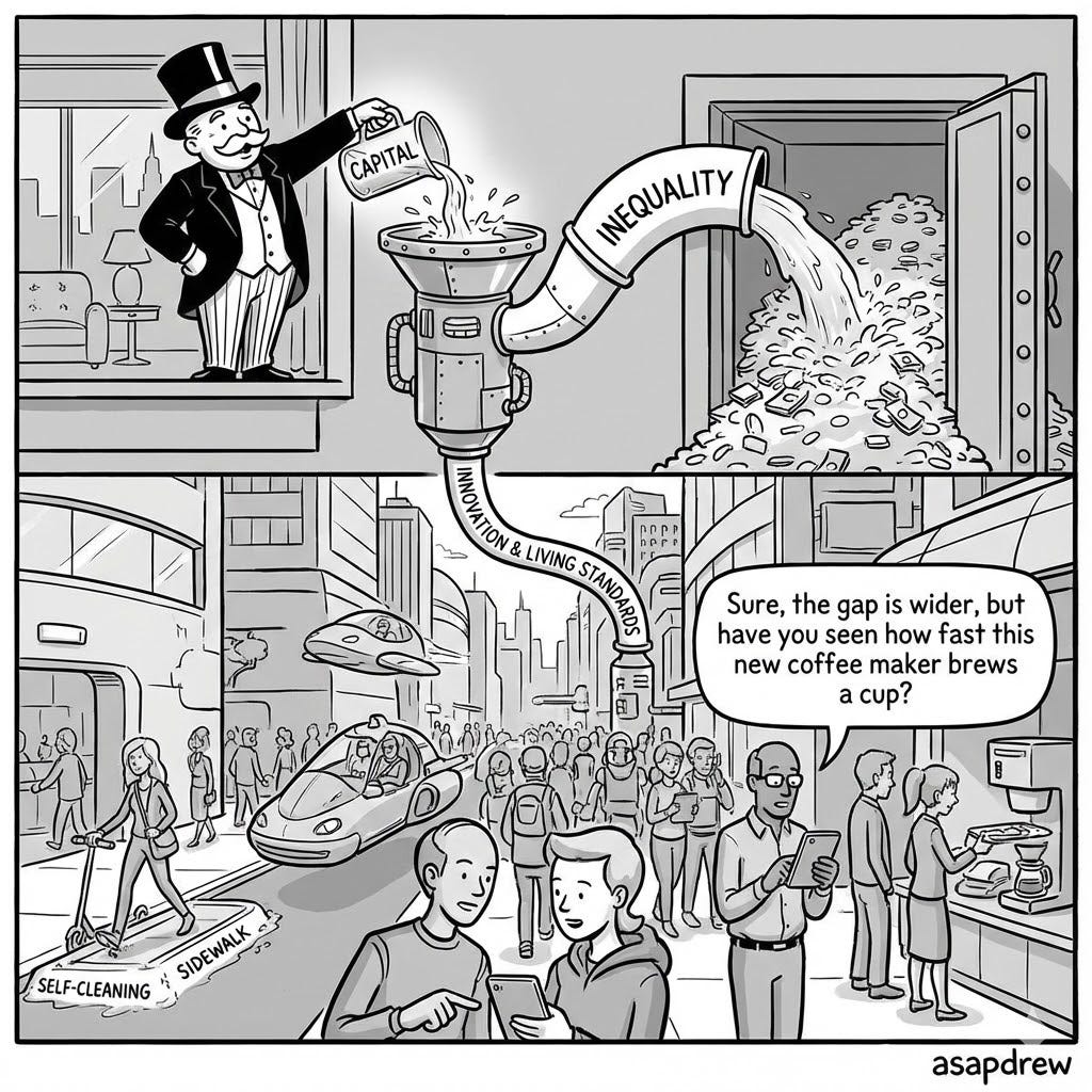 The problem with this view is that innovation and the baseline living standard will increase significantly faster if you embrace inequality. If you force equality or set boundaries (assuming free market, low corruption, low regulation system)… you just prolong shittier living conditions for everyone (including the poor).
