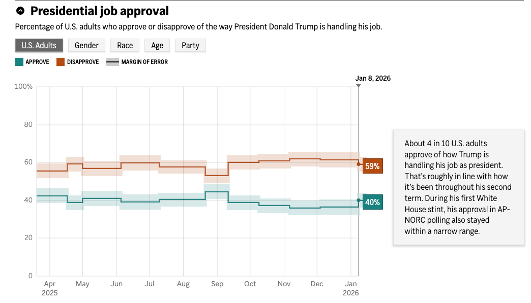 The president’s party historically faces midterm headwinds (an average loss of 26 House seats since 1932, and Trump’s approval sat at ~40% in January 2026.
