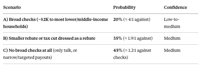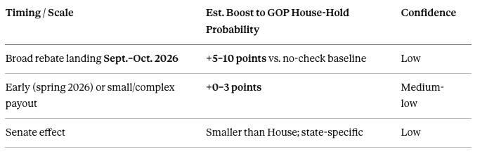 Rebate landing Sept. to Oct. 2026: Estimated +5–10 points boost vs. no-check baseline. Confidence: Low. Lots of unknowns and highly timing-sensitive.
