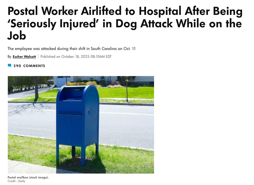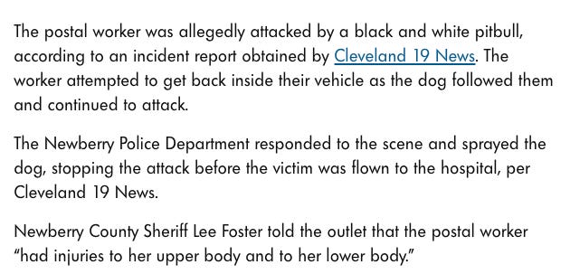 Continue reading and we find out that the postal worker was *allegedly attacked by a black and white pitbull*… *allegedly* we can’t know for sure. Could’ve been a Yorkie or Golden Retriever… those Yorkies are vicious!